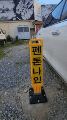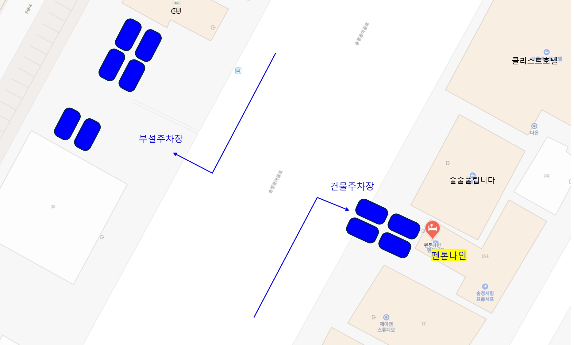 “펜톤나인” 주차봉을 살짝 들어 눕힌 후 주차해주세요. [펜톤나인 주차봉 자리 외 주차금지]