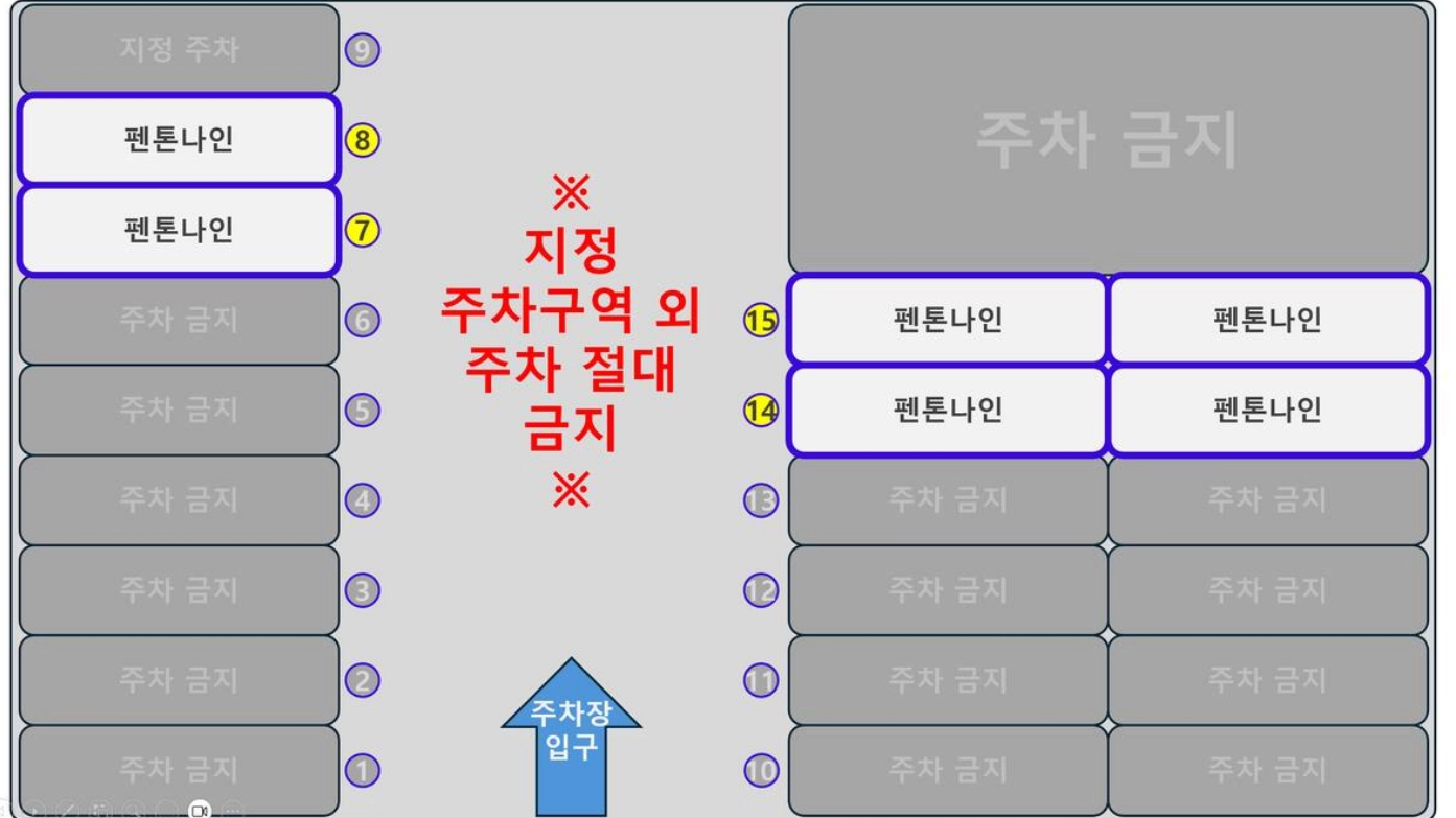 “펜톤나인” 주차봉을 위로 당겨 눕힌 후 주차해주세요. [펜톤나인 주차봉 자리 외 주차금지]